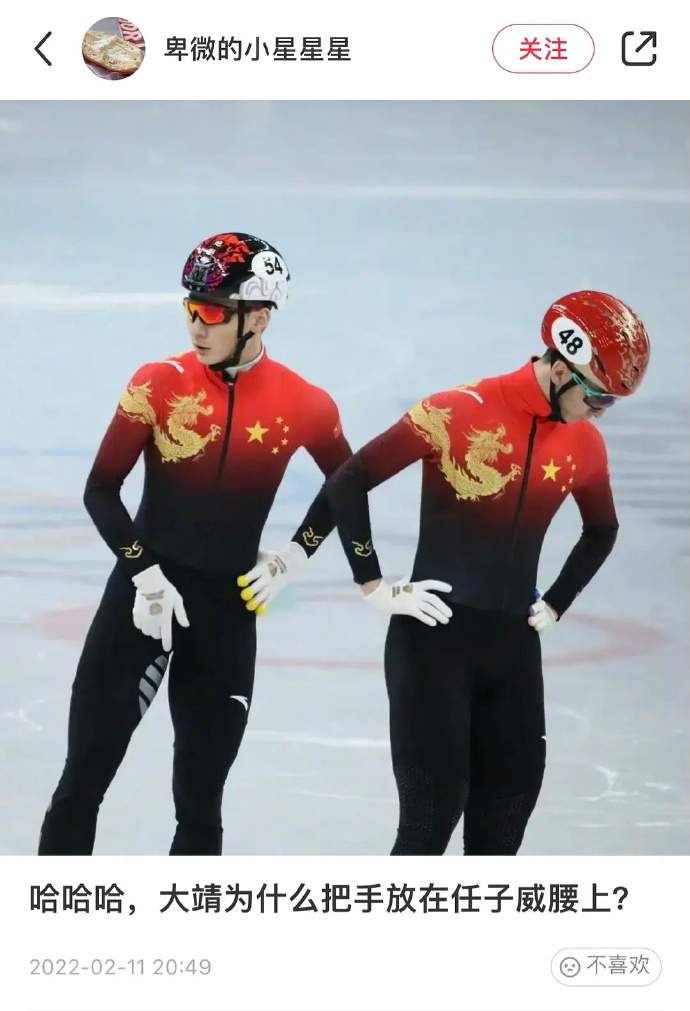 武大靖为什么把手放在任子威腰上。