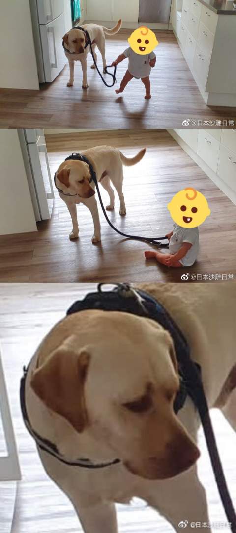 被连走路都还走不稳的小主子牵着似乎很是不服的狗勾。